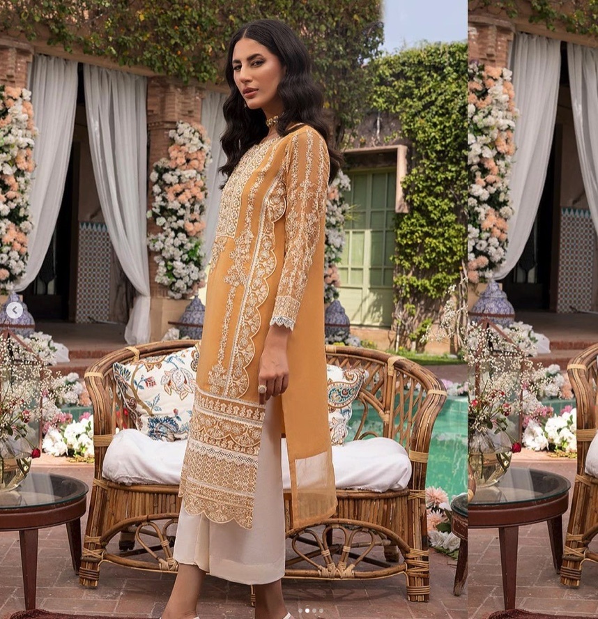 ₨3,850.00This modern mustard yellow ensemble is rendered on an organza base with sophisticated sequins embroidery at the front and sleeves to strike the perfect balance between exotic details and timeless perfection. It is paired with off white raw silk trousers. Doesn’t it take your breath away? Ready to wear 2 pc Size: M #pakistanistreetstyle #pakistaniwear #pakistanidesigner #originalcollection #pakistanifashionweek #mauritiuswedding